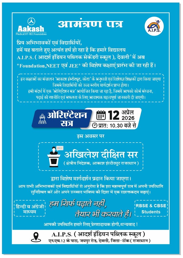 देवली:-(बृजेश भारद्वाज)। शहर के जयपुर स्थित आदर्श इंडियन पब्लिक स्कूल एआईपीएस में अब विद्यार्थियों के भविष्य के लिए फाउंडेशन नीट और जेईई की विशेष कक्षाएं शुरू की जा रही हैं। इन कक्षाओं का संचालन कोटा ‘आकाश इंस्टीट्यूट’ के अनुभवी और विशेषज्ञ शिक्षकों द्वारा किया जाएगा। इस नई पहल के माध्यम से क्षेत्र के विद्यार्थियों को अब उच्च स्तरीय कोचिंग और मार्गदर्शन अपने ही शहर में प्राप्त हो सकेगा। स्कूल डायरेक्टर मोहित मंगल ने बताया कि इस शैक्षणिक सत्र की शुरुआत के उपलक्ष्य में 12 अप्रैल को विद्यालय परिसर में ओरिएंटेशन सत्र का आयोजन किया जा रहा है। यह कार्यक्रम सुबह 10:30 बजे से शुरू होगा। इस सत्र में आकाश इंस्टीट्यूट राजस्थान के क्षेत्रीय निदेशक अखिलेश दीक्षित मुख्य वक्ता के रूप में उपस्थित रहेंगे। वे विद्यार्थियों को परीक्षा की तैयारी, रणनीति और कोर्स की संरचना के बारे में विस्तार से जानकारी देंगे। यह कार्यक्रम पूरी तरह से निशुल्क है और इसमें हिंदी व अंग्रेजी दोनों माध्यमों के RBSE एवं CBSE बोर्ड के विद्यार्थी भाग ले सकते हैं। विद्यालय प्रशासन ने सभी अभिभावकों और छात्रों को आमंत्रित किया है कि वे विद्यालय परिसर में पहुंचकर इस मार्गदर्शन सत्र का लाभ उठाएं और अपने करियर की दिशा में एक प्रभावी कदम बढ़ाएं।