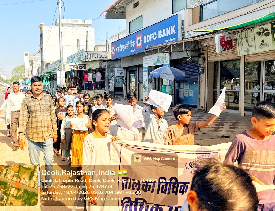 देवली:-(बृजेश भारद्वाज)। शनिवार को माननीय राजस्थान राज्य विधिक सेवा प्राधिकरण जयपुर के निर्देशानुसार तालुका विधिक सेवा समिति देवली द्वारा शहीद सोहन लाल वर्मा राजकीय उच्च प्राथमिक विद्यालय देवली के तत्वावधान में विधालय के बच्चो द्वारा देवली शहर में रैली का आयोजन किया गया सचिव तालुका विधिक सेवा समिति विजय गौड़ एवं पीएलवी भगवान कंवर द्वारा बाल विवाह के प्रति बच्चों को जागरूक किया एवं आगामी वैवाहिक सीजन (जैसे: आखा तीज/पीपल पूर्णिमा) के मद्देनजर बाल विवाह जैसी सामाजिक बुराई को समाप्त करना है बाल विवाह न केवल एक कानूनी अपराध है, बल्कि यह बच्चों के शारीरिक और मानसिक स्वास्थ्य के साथ एक बड़ा खिलवाड़ भी है।