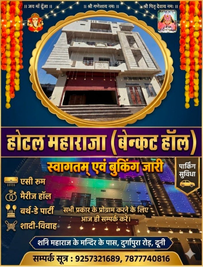 देवली:-(बृजेश भारद्वाज)। शनिवार को दूनी में होटल महाराजा का भव्य उद्घाटन समारोह आयोजित हुआ। जहाँ मुख्य अतिथि के तौर पर शिव शिक्षा समिति सरोली के निदेशक डॉ शिवजी लाल चौधरी ने व विशिष्ठ अतिथि सत्यनारायण तिवाड़ी ने फीता काटकर शुभारंभ किया। माँ भगवती दुणजा की अनंत कृपा से अभिसिंचित इस पावन अवसर पर, दूनी नगरी ने एक गौरवपूर्ण अध्याय जोड़ लिया। कर्मभूमि भले ही हैदराबाद रही हो, परंतु जन्मभूमि के प्रति अटूट श्रद्धा और समर्पण का जो अनुपम उदाहरण पं. घासी महाराज ने प्रस्तुत किया है, वह न केवल प्रेरणादायक है, बल्कि समाज के लिए एक आदर्श भी है। शनि महाराज मंदिर के समीप स्थापित भव्य, दिव्य और अत्याधुनिक चार मंजिला “महाराजा होटल” का उद्घाटन समारोह सचमुच ऐतिहासिक रहा। इस शानदार निर्माण में पं. घासी महाराज की अथक परिश्रम, दूरदर्शिता और उत्कृष्ट सौंदर्यबोध की झलक स्पष्ट परिलक्षित होती है। यह होटल केवल एक इमारत नहीं, बल्कि दूनी के विकास और आधुनिकता की ओर बढ़ते कदम का सशक्त प्रतीक है। उद्घाटन के इस पावन अवसर पर 31 किलो की भव्य माला पहनाकर किया गया अभिनंदन न केवल सम्मान का प्रतीक था, बल्कि उनके विशाल हृदय और प्रेमपूर्ण व्यक्तित्व का भी परिचायक है। इस अवसर पर वरिष्ठ सेवानिवृत्त शिक्षक सत्यनारायण तिवाड़ी, रामदेव साहू सहित दूनी के अनेक गणमान्य एवं प्रतिष्ठित नागरिकों मौजूद रहे। जो कि इस आयोजन की गरिमा को और भी बढ़ाने वाली रही। शिक्षाविद जनसेवक डॉ शिवजीलाल चौधरी ने इस मौके पर कहा कि निस्संदेह, “महाराजा होटल” दूनी में शहर जैसी आधुनिक सुविधाओं से युक्त एक उत्कृष्ट स्थल के रूप में स्थापित होगा और क्षेत्र के विकास में मील का पत्थर सिद्ध होगा।होटल के मालिक घासी लाल ने बताया कि यहाँ मिलेगा शानदार गार्डन, वातानुकूलित कमरे(AC Room) व पार्किंग की बेहतरीन सुविधा। जहाँ सभी प्रकार के कार्यक्रम बर्थ-डे पार्टी,शादी-विवाह आदि प्रोग्राम बेहतर सुविधाओ के साथ संपन्न हो सकेंगे। उक्त होटल व गार्डन की बुकिंग करने के लिए 9257321689,7877740816 नम्बरो पर सम्पर्क किया जा सकता है।
